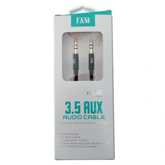 Cabo auxiliar "P2-P2" da Fam possui a ponta banhada a ouro, garantindo uma qualidade de som premium. íƒâ€° reforíƒÂ§ado em Nylon, e seu acabamento íƒÂ© feito em alumínio.