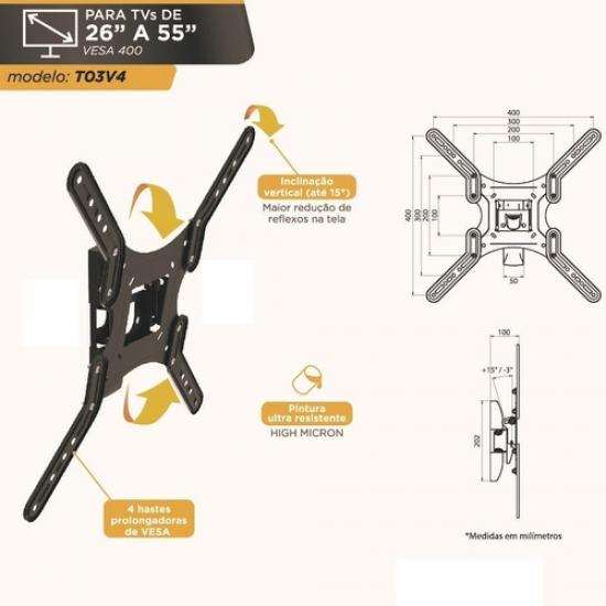 | SUPORTE P/TV INCLINAVEL 26' A 55' POL.30KG TO3V4 PRETO |